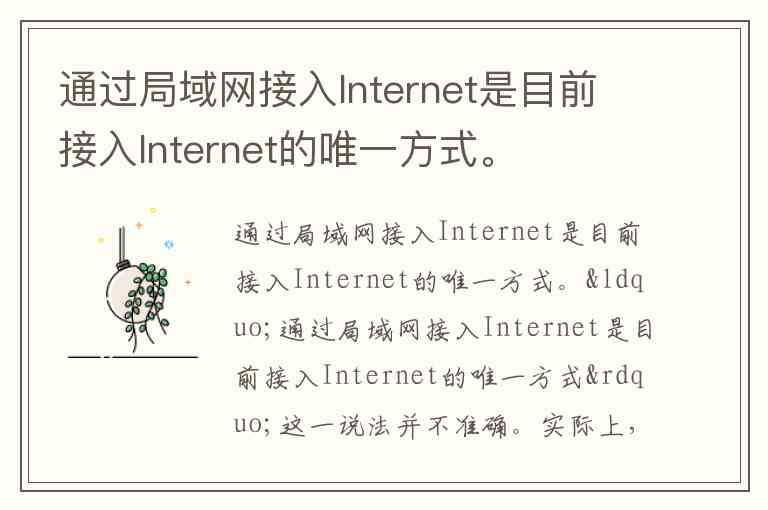 “通过局域网接入Internet是目前接入Internet的唯一方式”这一说法并不准确。实际上,现代互联网接入技术呈现多样化发展,除局域网外,还包括多种有线和无线接入方式,覆盖家庭、企业和移动场景。