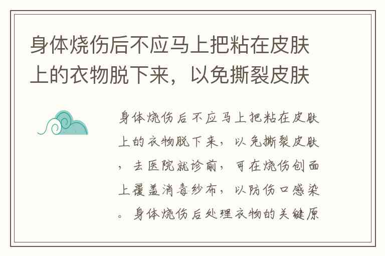 身体烧伤后不应马上把粘在皮肤上的衣物脱下来,以免撕裂皮肤,去医院就诊前,可在烧伤创面上覆盖消毒纱布,以防伤口感染。