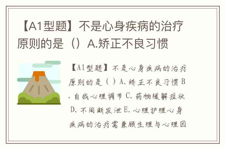 【A1型题】不是心身疾病的治疗原则的是()A.矫正不良习惯 B.自我心理调节 C.药物缓解症状 D.不间断发泄 E.心理护理