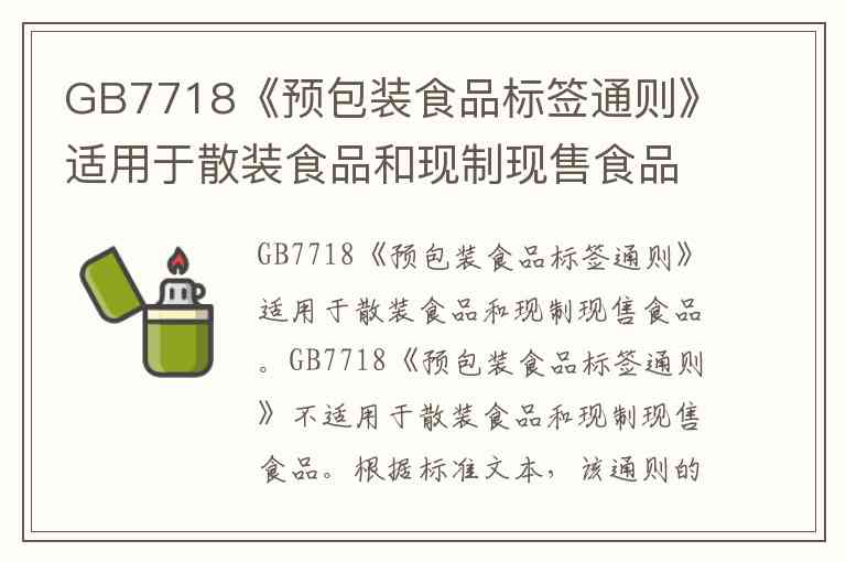 GB7718《预包装食品标签通则》不适用于散装食品和现制现售食品。根据标准文本,该通则的适用范围明确限定为“直接提供给消费者的预包装食品标签”和“非直接提供给消费者的预包装食品标签”,而明确排除了“散装食品和现制现售食品的标识”。