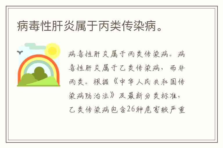 病毒性肝炎属于乙类传染病,而非丙类。根据《中华人民共和国传染病防治法》及最新分类标准,乙类传染病包含26种危害较严重的疾病,需在24小时内进行网络直报,其中明确将病毒性肝炎列为乙类管理范畴。这一分类适用于甲型、乙型、丙型、丁型和戊型五种肝炎类型,尽管它们的传播途径和临床表现存在差异——例如甲肝和戊肝主要通过消化道传播,乙肝和丙肝则通过血液、母婴和性接触传播。