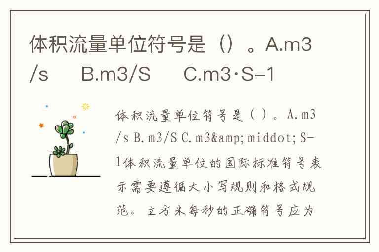 体积流量单位的国际标准符号表示需要遵循大小写规则和格式规范。立方米每秒的正确符号应为小写"m³/s",其中"m"(米)和"s"(秒)均为小写,斜杠表示"每"的关系。选项B中"S"为大写错误,选项C的指数形式虽在某些场景使用,但题目明确要求"符号"而非数学表达式。