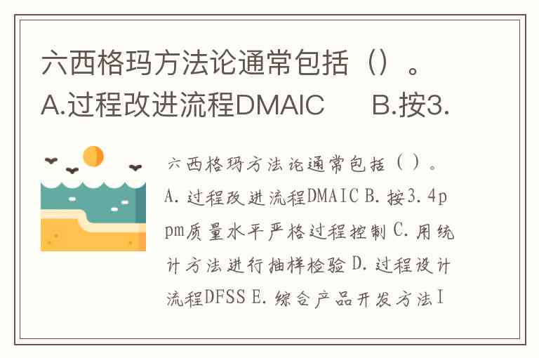 六西格玛方法论通常包括()。A.过程改进流程DMAIC B.按3.4ppm质量水平严格过程控制 C.用统计方法进行抽样检验 D.过程设计流程DFSS E.综合产品开发方法IPD