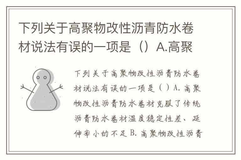 高聚物改性沥青防水卷材是通过在沥青中添加高分子聚合物(如橡胶或塑料树脂)改善其性能的防水材料,目前已成为我国防水卷材的主导产品之一。题目中说法有误的是D选项,根据国家标准和实际应用,这类卷材不仅适用于Ⅰ级屋面防水工程,还广泛应用于工业与民用建筑的屋面、地下工程、桥梁、停车场等多种场景。