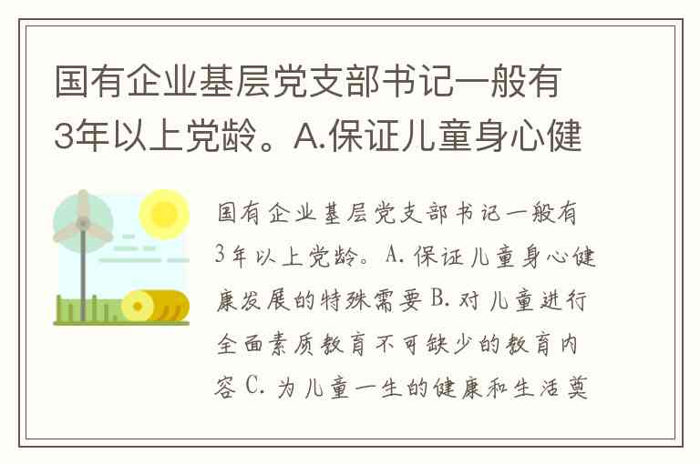 国有企业基层党支部书记一般有3年以上党龄。A.保证儿童身心健康发展的特殊需要 B.对儿童进行全面素质教育不可缺少的教育内容 C.为儿童一生的健康和生活奠定良好的基础 D.国家、民族发展的需要