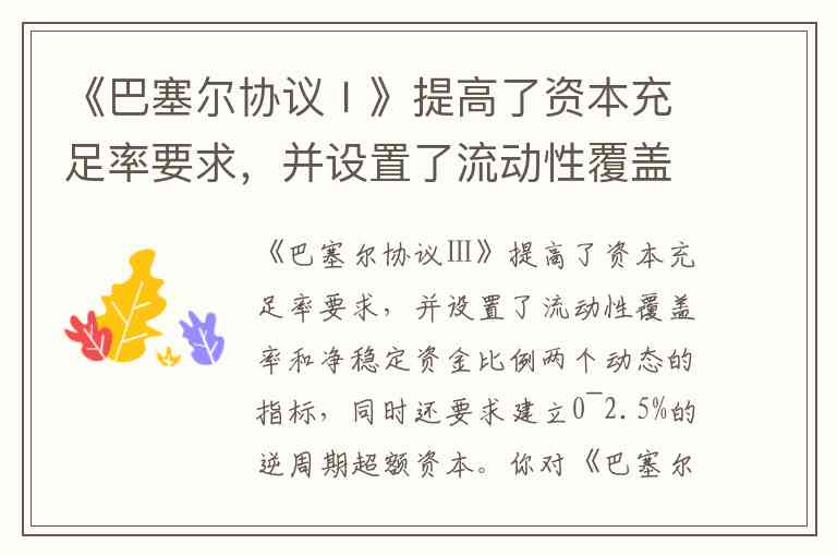 《巴塞尔协议Ⅰ》提高了资本充足率要求,并设置了流动性覆盖率和净稳定资金比例两个动态的指标,同时还要求建立0~2.5%的逆周期超额资本。