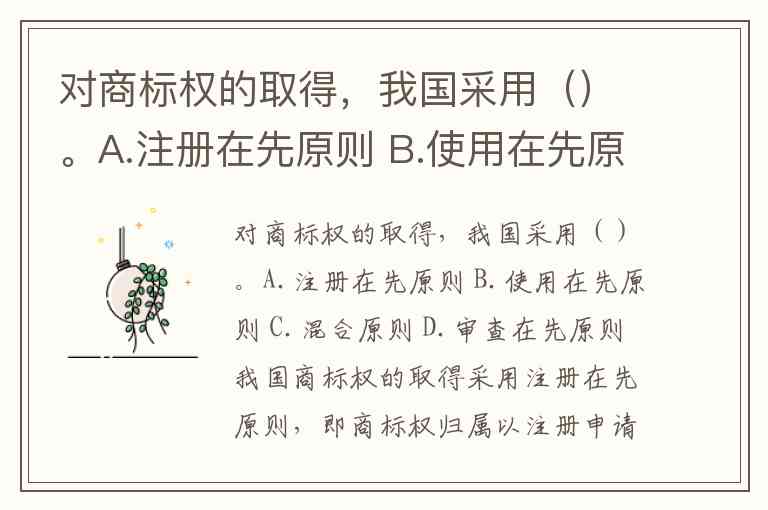 对商标权的取得,我国采用()。A.注册在先原则 B.使用在先原则 C.混合原则 D.审查在先原则