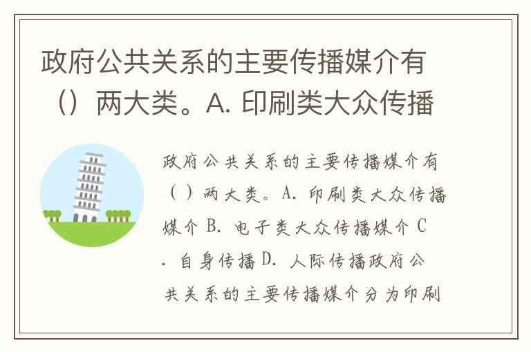 政府公共关系的主要传播媒介分为印刷类大众传播媒介和电子类大众传播媒介两大类,对应选项A和B。这一分类基于媒介的物质载体属性,是公共关系理论中对传播渠道的经典划分。