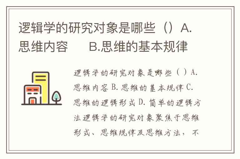逻辑学的研究对象聚焦于思维形式、思维规律及思维方法,不包含思维内容本身。根据文档内容,正确选项为 B.思维的基本规律、C.思维的逻辑形式、D.简单的逻辑方法,而A.思维内容不属于逻辑学研究范畴。