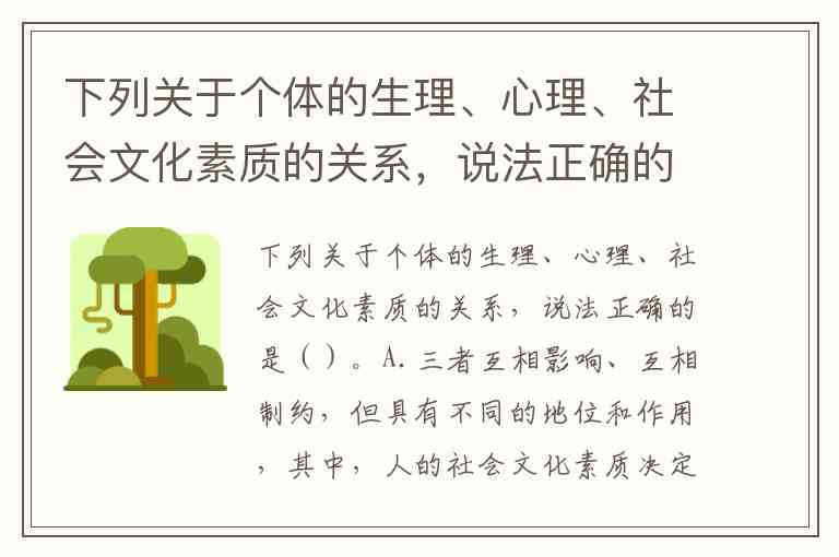 下列关于个体的生理、心理、社会文化素质的关系,说法正确的是()。A.三者互相影响、互相制约,但具有不同的地位和作用,其中,人的社会文化素质决定素质发展的性质和方向 B.生理素质决定心理素质 C.心理素质决定生理素质 D.三者彼此独立,互不影响