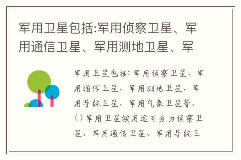 军用卫星按用途可分为侦察卫星、军用通信卫星、军用导航卫星、军用测地卫星、军用气象卫星等类型,题目中的分类准确。这些卫星共同构成现代军事指挥与武器系统的重要组成部分,占全球航天器总量的三分之二以上。