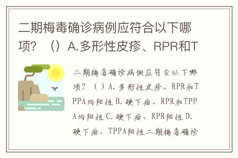 二期梅毒确诊病例应符合以下哪项?()A.多形性皮疹、RPR和TPPA均阳性 B.硬下疳、RPR和TPPA均阳性 C.硬下疳、RPR阳性 D.硬下疳、TPPA阳性