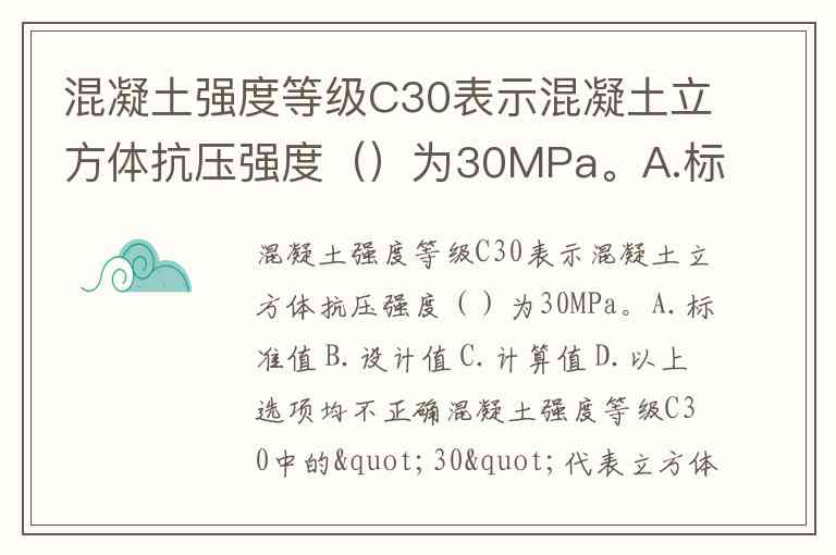 混凝土强度等级C30表示混凝土立方体抗压强度()为30MPa。A.标准值 B.设计值 C.计算值 D.以上选项均不正确
