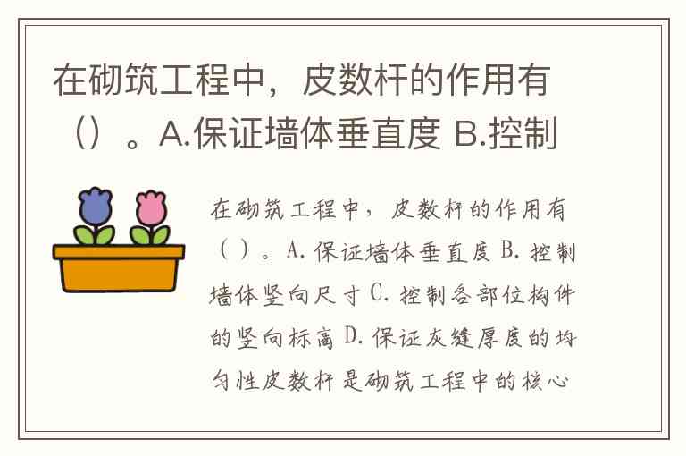 在砌筑工程中,皮数杆的作用有()。A.保证墙体垂直度 B.控制墙体竖向尺寸 C.控制各部位构件的竖向标高 D.保证灰缝厚度的均匀性
