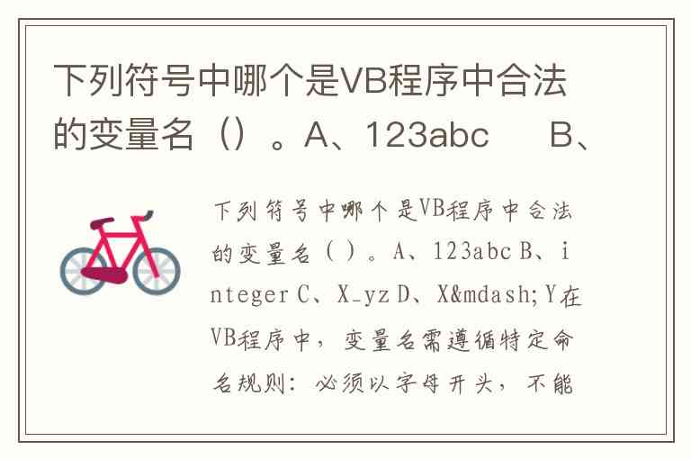 在VB程序中,变量名需遵循特定命名规则:必须以字母开头,不能包含空格或特殊字符(如减号、句点等),且不能使用VB关键字。我们对各选项分析如下: