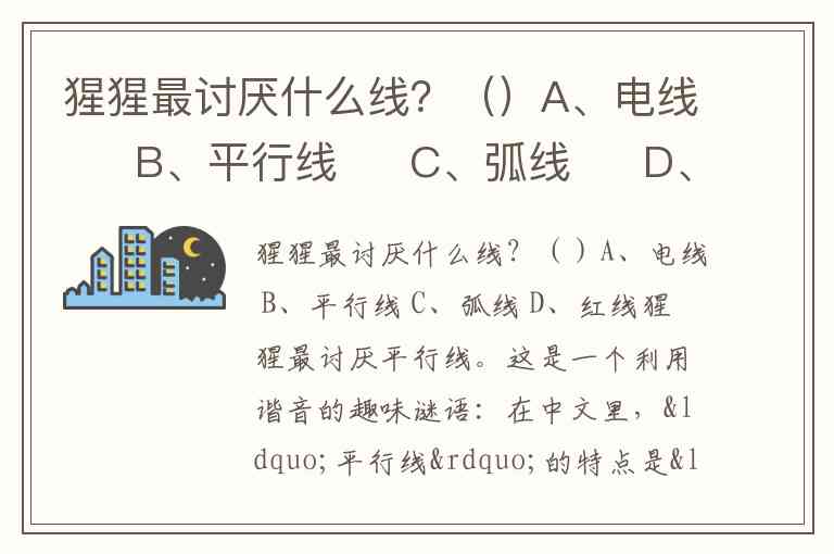 猩猩最讨厌平行线。这是一个利用谐音的趣味谜语:在中文里,“平行线”的特点是“永不相交”,而“相交”与“香蕉”发音完全相同。猩猩喜爱香蕉,自然会“讨厌”那些永远无法“相交”(获得香蕉)的平行线。