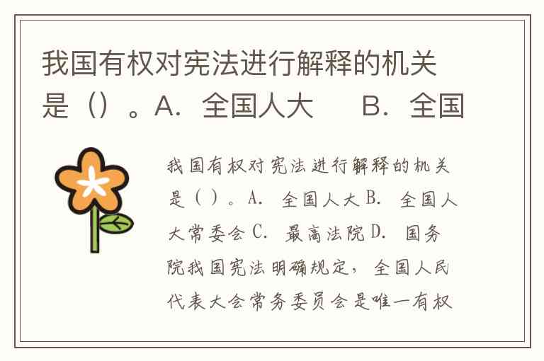 我国有权对宪法进行解释的机关是()。A.全国人大 B.全国人大常委会 C.最高法院 D.国务院