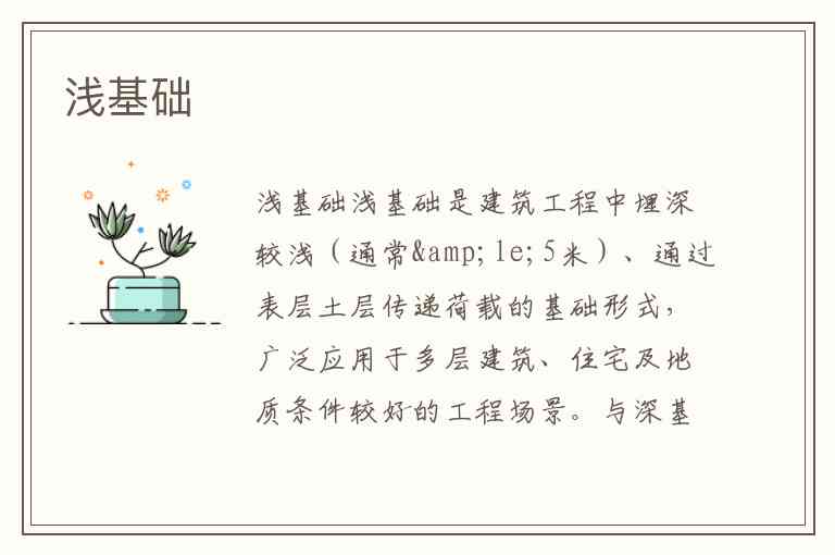 浅基础是建筑工程中埋深较浅(通常≤5米)、通过表层土层传递荷载的基础形式,广泛应用于多层建筑、住宅及地质条件较好的工程场景。与深基础相比,它具有施工简便、造价低、工期短等优势,但承载力相对有限,适用于地基土层稳定、荷载较小的情况。