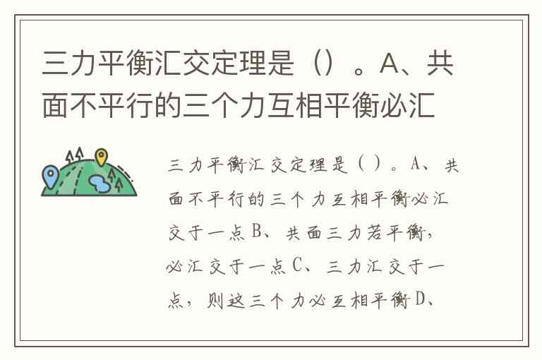 三力平衡汇交定理是()。A、共面不平行的三个力互相平衡必汇交于一点 B、共面三力若平衡,必汇交于一点 C、三力汇交于一点,则这三个力必互相平衡 D、此三个力必定互相平行