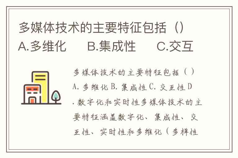 多媒体技术的主要特征包括()A.多维化 B.集成性 C.交互性 D.数字化和实时性
