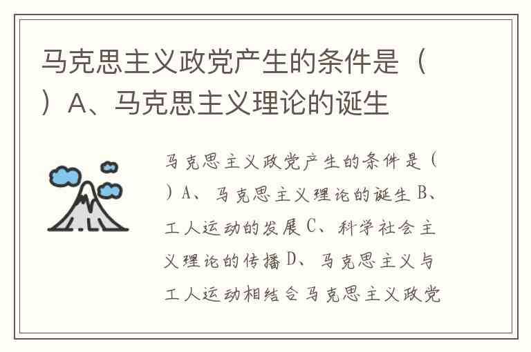 马克思主义政党产生的条件是()A、马克思主义理论的诞生 B、工人运动的发展 C、科学社会主义理论的传播 D、马克思主义与工人运动相结合