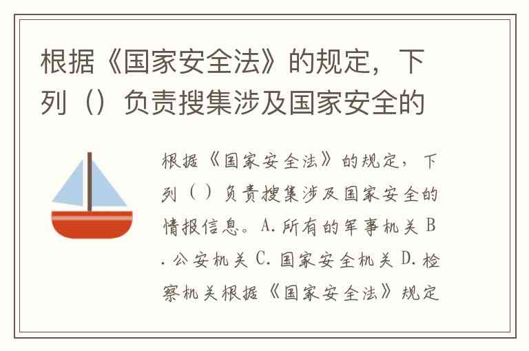 根据《国家安全法》的规定,下列()负责搜集涉及国家安全的情报信息。A.所有的军事机关 B.公安机关 C.国家安全机关 D.检察机关