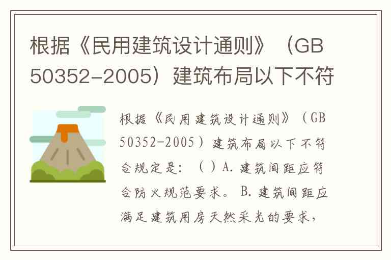 根据《民用建筑设计通则》(GB50352-2005)建筑布局以下不符合规定是:()A.建筑间距应符合防火规范要求。 B.建筑间距应满足建筑用房天然采光的要求,不考虑视线干扰。 C.建筑布局应使建筑基地内的人流、车流与物流合理分流,防止干扰,并有利于消防、停车和人员集散。 D.建筑与各种污染源的距离,应符合有关卫生防护的标准。