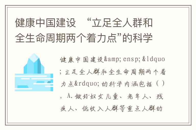 健康中国建设 “立足全人群和全生命周期两个着力点”的科学内涵包括()。A.做好妇女儿童、老年人、残疾人、低收入人群等重点人群的健康工作 B.对生命不同阶段主要健康问题及主要影响因素的有效干预 C.健康政策惠及全人群、覆盖全生命周期 D.实现更高水平的全民健康