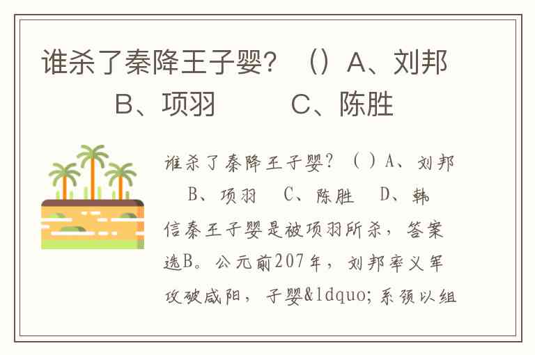 谁杀了秦降王子婴?()A、刘邦 B、项羽 C、陈胜 D、韩信