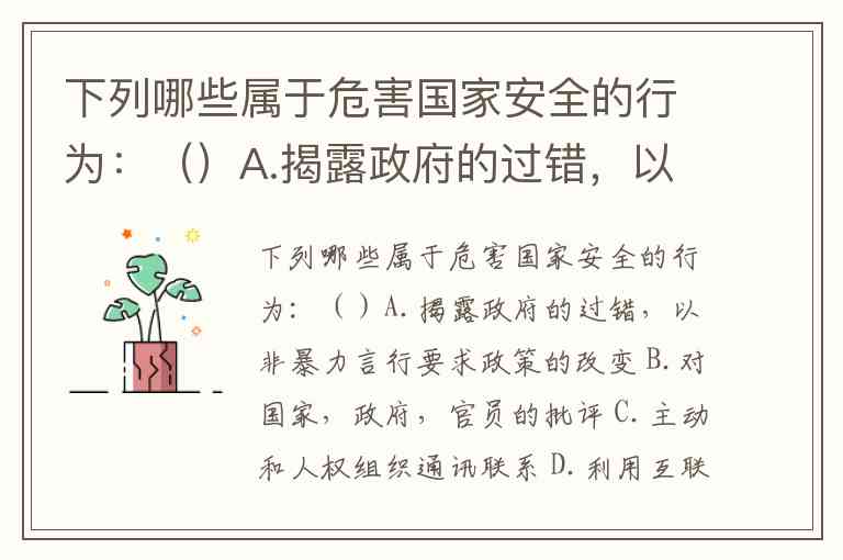 下列哪些属于危害国家安全的行为:()A.揭露政府的过错,以非暴力言行要求政策的改变 B.对国家,政府,官员的批评 C.主动和人权组织通讯联系 D.利用互联网,传播对社会和国家的负面言论,诋毁伟人形象,造成社会群众愤慨