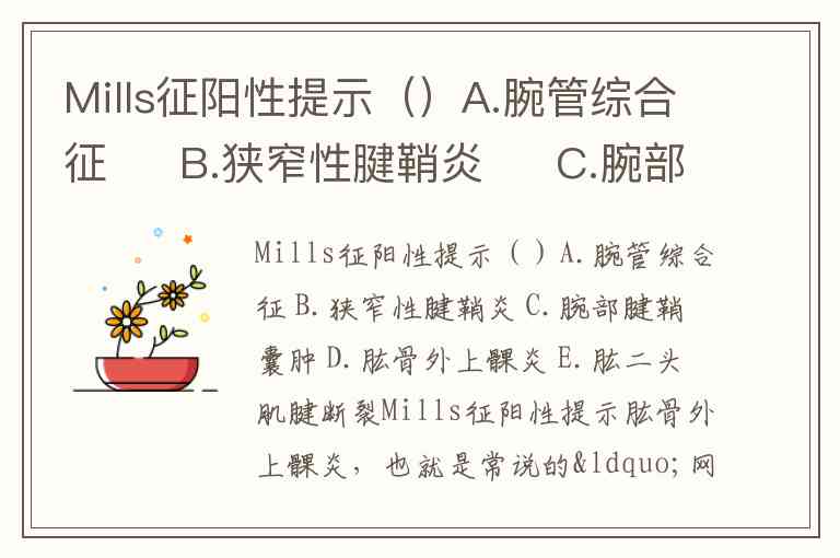 Mills征阳性提示()A.腕管综合征 B.狭窄性腱鞘炎 C.腕部腱鞘囊肿 D.肱骨外上髁炎 E.肱二头肌腱断裂