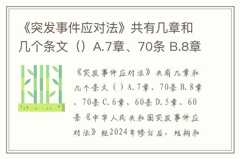 《突发事件应对法》共有几章和几个条文()A.7章、70条 B.8章、70条 C.6章、60条 D.5章、60条