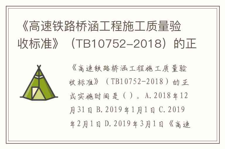 《高速铁路桥涵工程施工质量验收标准》(TB10752-2018)的正式实施时间是()。A.2018年12月31日 B.2019年1月1日 C.2019年2月1日 D.2019年3月1日