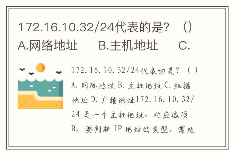 172.16.10.32/24代表的是?()A.网络地址 B.主机地址 C.组播地址 D.广播地址