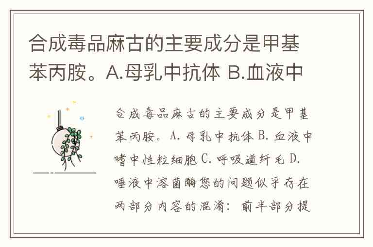 您的问题似乎存在两部分内容的混淆:前半部分提到“合成毒品麻古的主要成分是甲基苯丙胺”,后半部分则列出了与人体免疫相关的选项(A.母乳中抗体 B.血液中嗜中性粒细胞 C.呼吸道纤毛 D.唾液中溶菌酶)。以下分别针对这两部分信息进行说明: