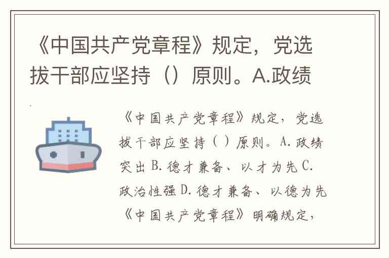 《中国共产党章程》规定,党选拔干部应坚持()原则。A.政绩突出 B.德才兼备、以才为先 C.政治性强 D.德才兼备、以德为先