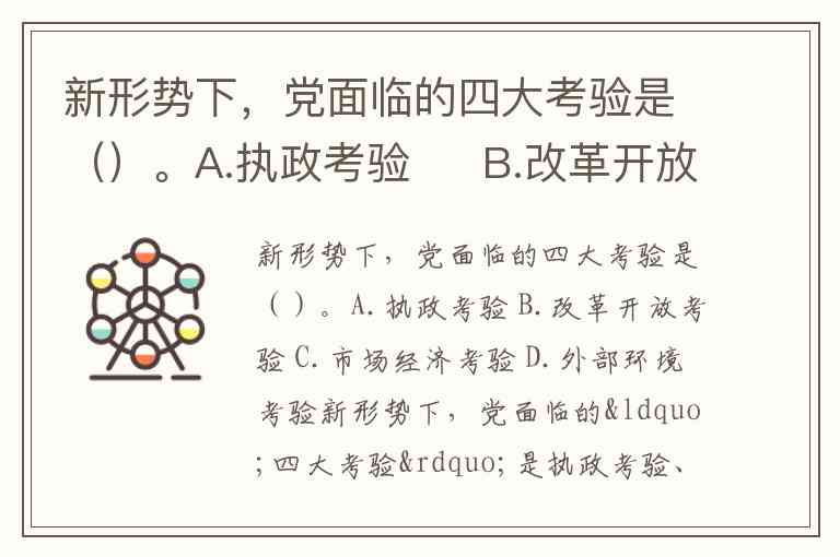 新形势下,党面临的四大考验是()。A.执政考验 B.改革开放考验 C.市场经济考验 D.外部环境考验