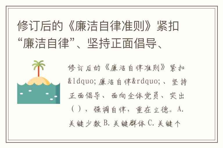 修订后的《廉洁自律准则》紧扣“廉洁自律”、坚持正面倡导、面向全体党员、突出(),强调自律,重在立德。A.关键少数 B.关键群体 C.关键个体 D.关键多数
