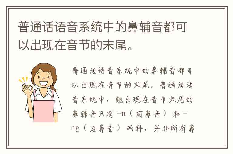 普通话语音系统中,能出现在音节末尾的鼻辅音只有 -n(前鼻音) 和 -ng(后鼻音) 两种,并非所有鼻辅音都可作韵尾。历史上,汉语曾有 -m、-n、-ng 三套鼻音韵尾(如古汉语“林”字曾以 -m 结尾,海外华人仍有 Lam 的拼写),但现代普通话已并入前、后鼻音两类对立。