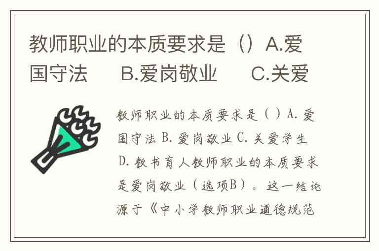 教师职业的本质要求是()A.爱国守法 B.爱岗敬业 C.关爱学生 D.教书育人