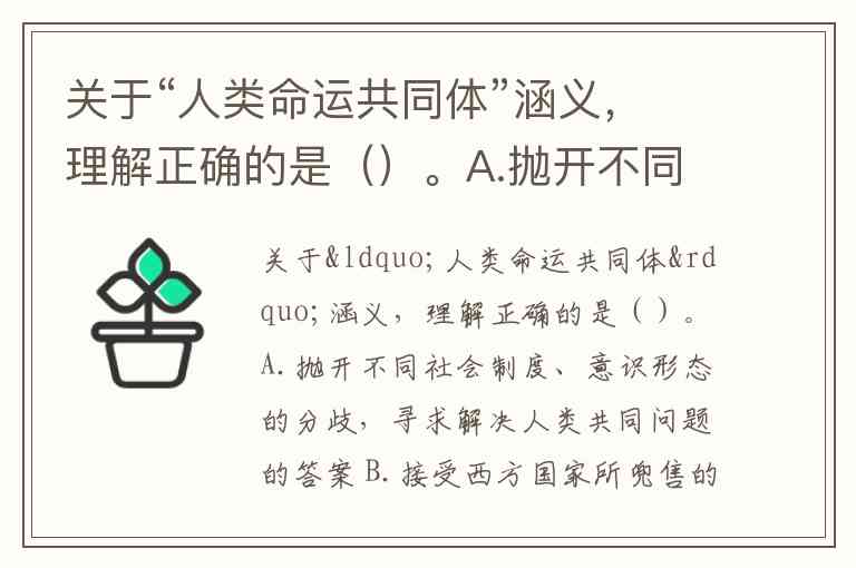 关于“人类命运共同体”涵义,理解正确的是()。A.抛开不同社会制度、意识形态的分歧,寻求解决人类共同问题的答案 B.接受西方国家所兜售的普世价值 C.不接受西方国家所兜售的普世价值 D.各个国家要平等,要商量,不要搞强权政治和霸权主义