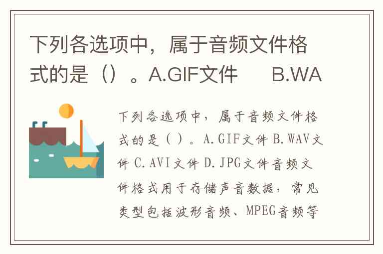 下列各选项中,属于音频文件格式的是()。A.GIF文件 B.WAV文件 C.AVI文件 D.JPG文件