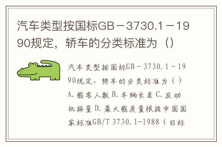 汽车类型按国标GB-3730.1-1990规定,轿车的分类标准为()A.载客人数 B.车辆长度 C.发动机排量 D.最大载质量