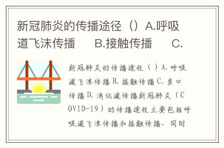 新冠肺炎的传播途径()A.呼吸道飞沫传播 B.接触传播 C.粪口传播 D.消化道传播