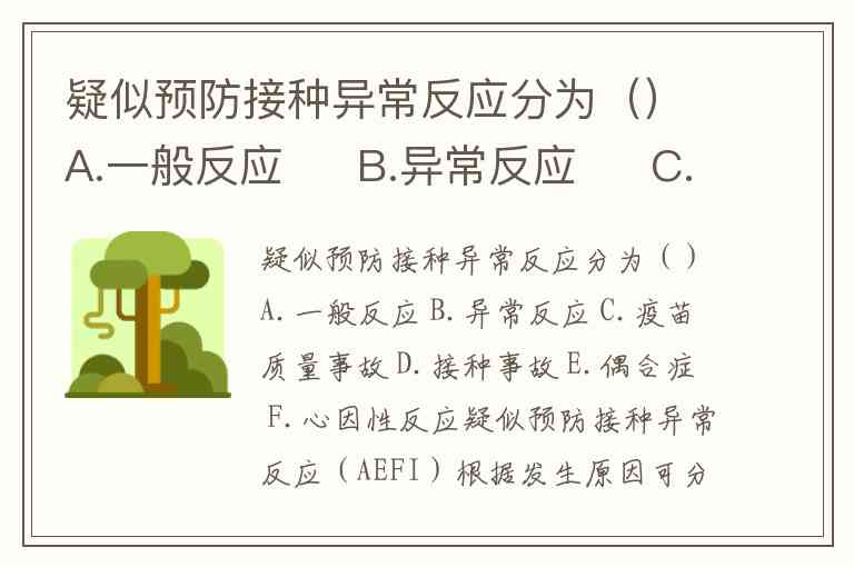 疑似预防接种异常反应(AEFI)根据发生原因可分为不良反应、疫苗质量事故、接种事故、偶合症、心因性反应五大类,其中不良反应进一步细分为一般反应和异常反应。因此题目中ABCDEF六项均属于AEFI的分类范畴,具体分类逻辑如下:
