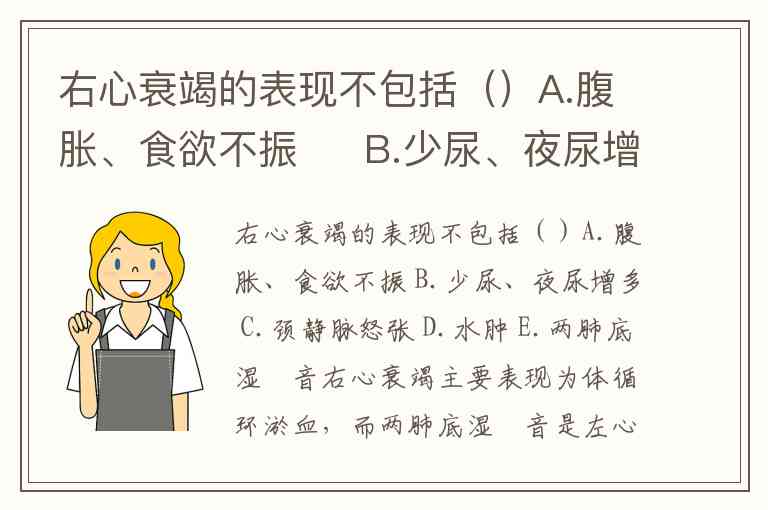 右心衰竭的表现不包括()A.腹胀、食欲不振 B.少尿、夜尿增多 C.颈静脉怒张 D.水肿 E.两肺底湿啰音