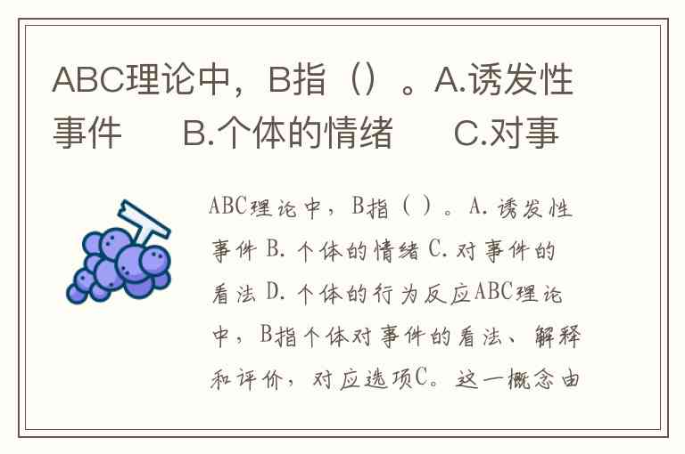 ABC理论中,B指个体对事件的看法、解释和评价,对应选项C。这一概念由美国心理学家埃利斯提出,是情绪认知理论的核心要素。