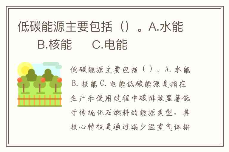 低碳能源是指在生产和使用过程中碳排放显著低于传统化石燃料的能源类型,其核心特征是通过减少温室气体排放应对气候变化。根据定义和分类标准,题目中的正确选项为 A.水能 和 B.核能,而 C.电能 不属于低碳能源范畴——电能是二次能源,其碳排放水平取决于发电来源(如煤电属于高碳,水电则为低碳)。