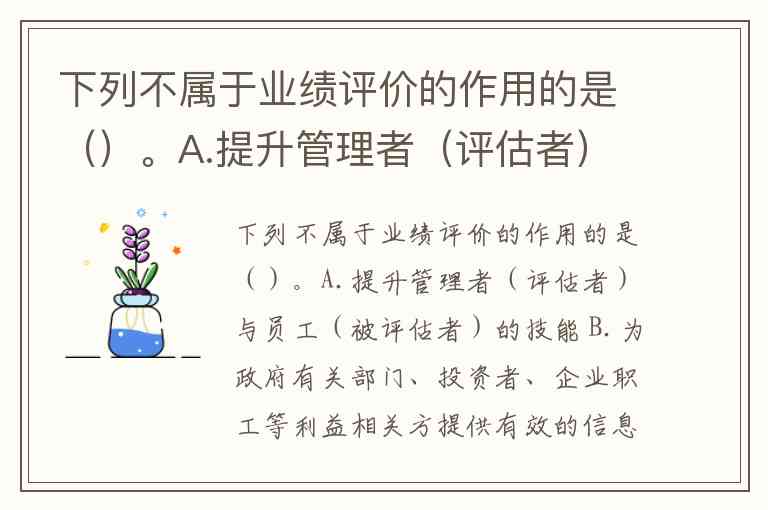 下列不属于业绩评价的作用的是()。A.提升管理者(评估者)与员工(被评估者)的技能 B.为政府有关部门、投资者、企业职工等利益相关方提供有效的信息支持 C.为有效激励企业经营者和员工提供公平可靠的依据 D.业绩评价是一个组织管理控制系统不可缺少的组成部分