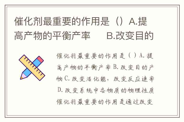 催化剂最重要的作用是()A.提高产物的平衡产率 B.改变目的产物 C.改变活化能,改变反应速率 D.改变系统中各物质的物理性质